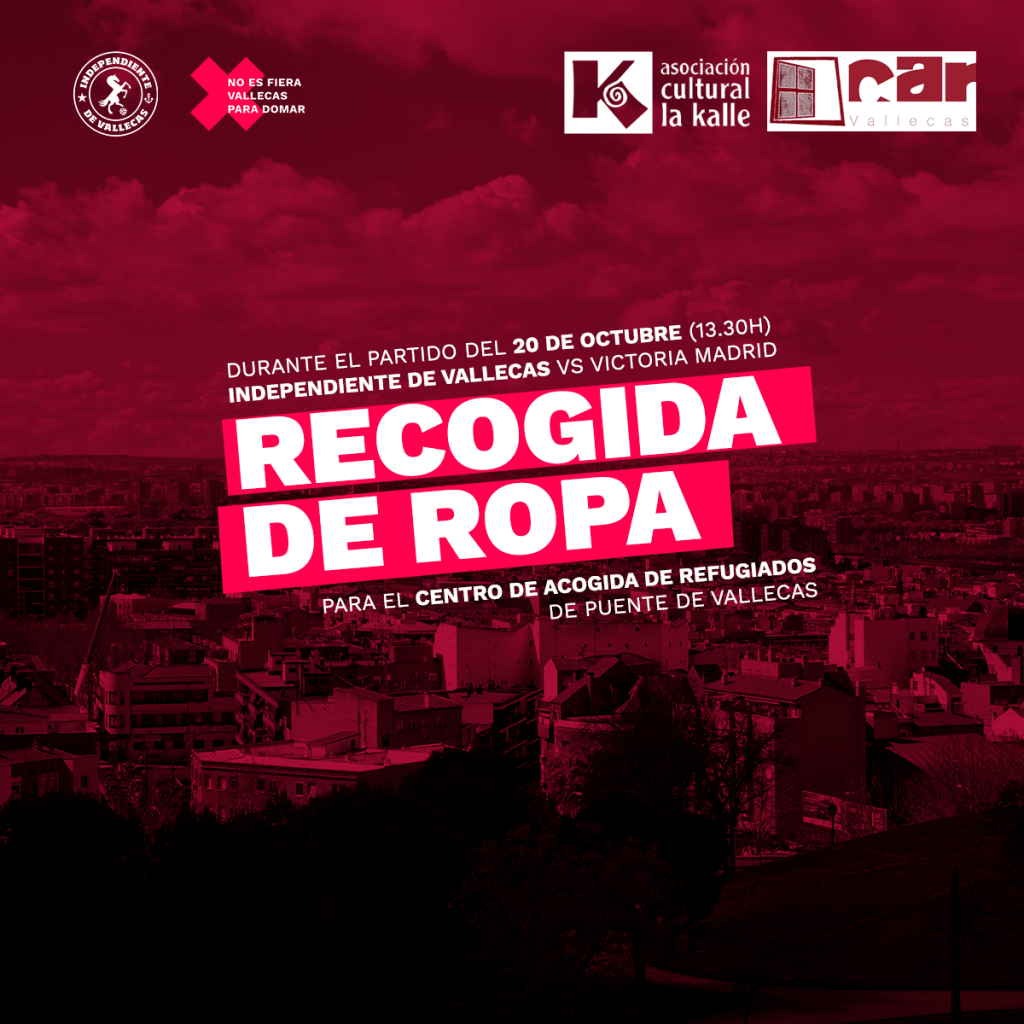 Durante el partido de este domingo 20 de octubre en La Unión estaremos colaborando con la Asociación Cultural La Kalle en una recogida de ropa de invierno en buen estado (calzado, chaquetas, abrigos, bufandas, gorros, guantes, etc) que irá destinada a las personas que residen en el Centro de Acogida de Refugiados de Puente de Vallecas.