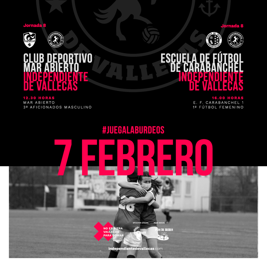 Este domingo 7 de febrero los dos equipos de Independiente jugarán fuera de casa. El Masculino no tendrá que salir de Vallecas para visitar al Mar Abierto a las 12:30 hs. El Femenino, por su parte, se desplazará hasta Carabanchel para enfrentarse a la Escuela de Fútbol Carabanchel a partir de las 16:00 hs.